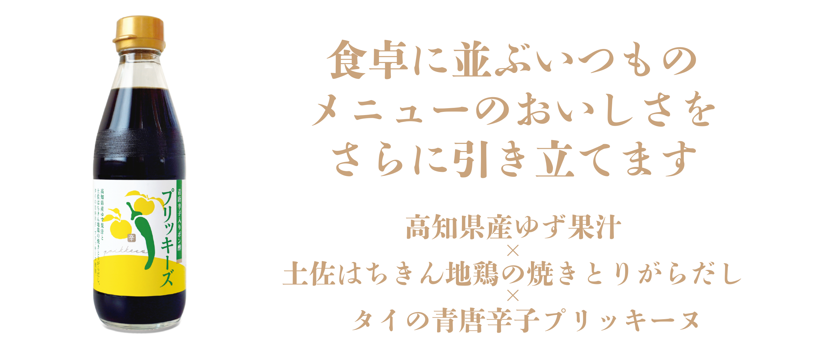 高知県産ゆず果汁・土佐はちきん地鶏の焼きとりがらだし・タイでおなじみの青唐辛子プリッキーヌを使用した、ピリッと刺激的なうま辛ポン酢。